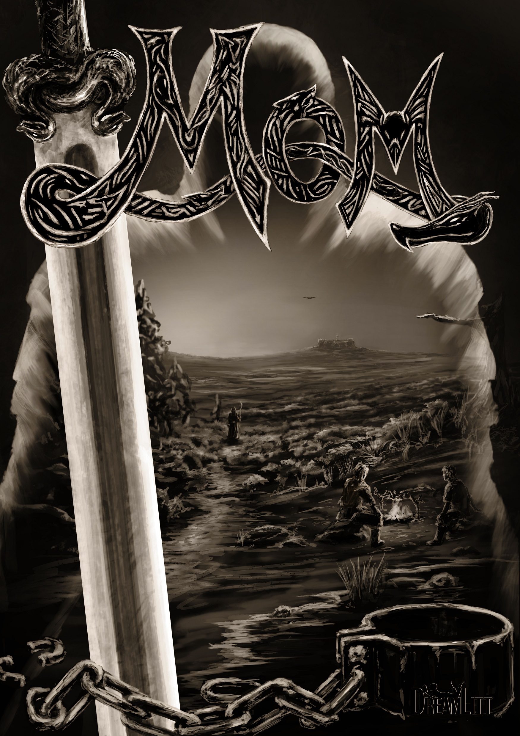 Ulf og Thorbjørn sidder ved deres lejrbål. Den sorte ravn, der på afstandhar fulgt dem hele dagen, iagttagerdem stadig. De kaster en godbid hen mod den. Den svæver ned fra træet, sluger maden, letter igen og forsvinder så op over trætoppene med et hæst skrig. Kort efter kommeren mystisk kvinde gående. Hun sætter sig ved deres bål, og snart hvirvler hun drengene ind i en utroligfortælling om vikingedrengen Mom, og hvordan hans saga blev til.