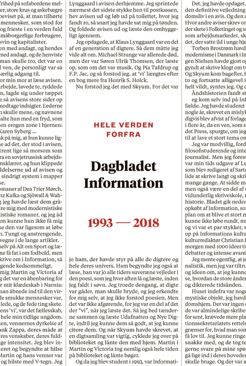 Hele verden forfra handler om de seneste 25 år på Dagbladet Information. Nuværende og tidligere journalister, redaktører og chefer fortæller om de journalistiske satsninger, de interne diskussioner, aktivismen, kulturdækningen og medieudviklingen på Information.